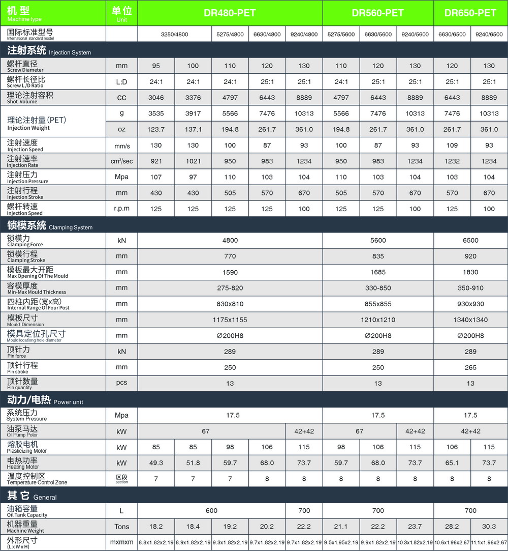 5、动力配置加大,提高电机过载能力和油泵排量输出,达到真正意义上的高速PET专用机。